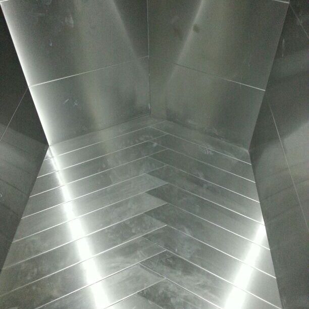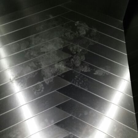 Suelo de acero inox personalizado, composición de diseño en lamas antideslizante a medida.